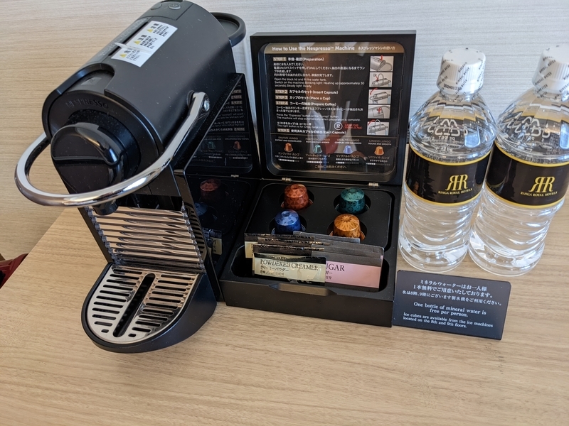無料のお水が2本。ネスプレッソのコーヒーもありました。味は4種類楽しめます。
