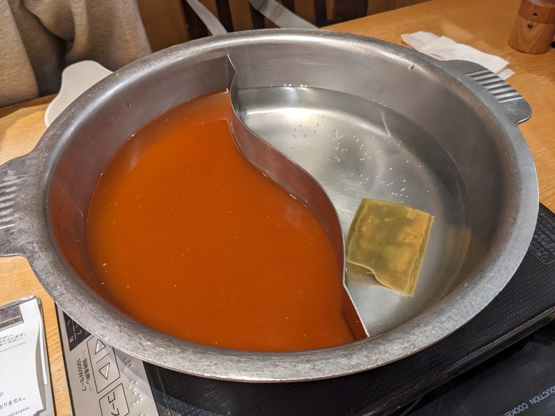しゃぶしゃぶの出汁は4種類から選べて、旨辛出汁と昆布出汁にしました。
