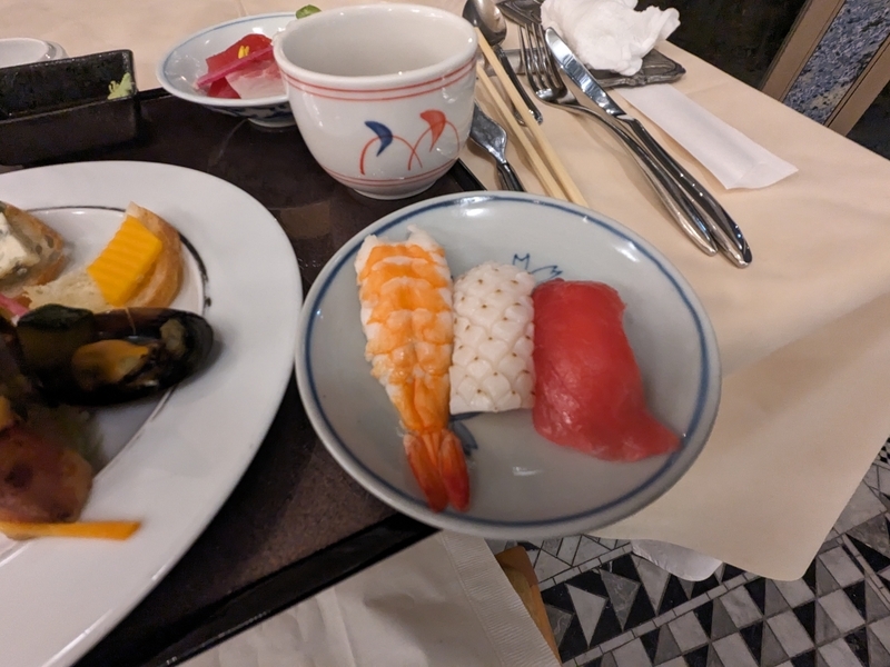 お寿司はマグロ・いか・海老×2。美味しくてお替わり。
