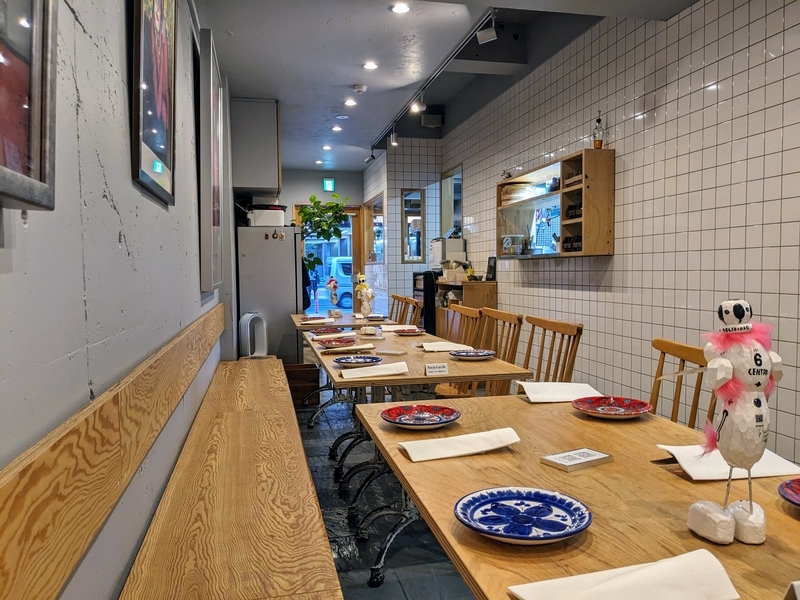 店内は白い壁とタイル、木のテーブルと椅子で統一されていて、シンプルな内装の中に