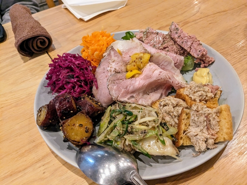 真ん中が自家製ハム・レッドキャベツのマリネ・人参のマリネ・田舎風パテ・バケットとツナ・イカと九条ネギの何とか、ハッキリとした料理名は忘れましたスミマセン。