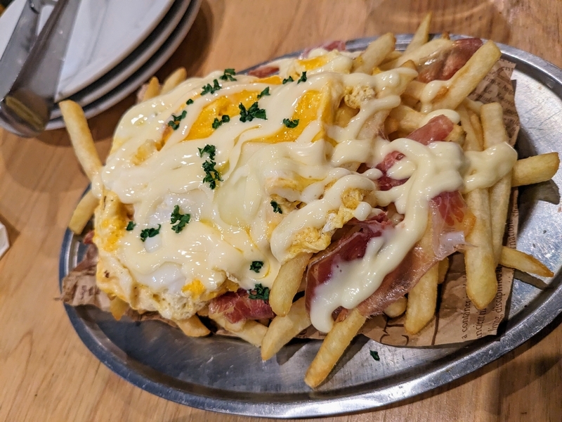 スクランブルエッグに生ハムを乗せたフライドポテトです。味付けは、マヨネーズとチーズでした。