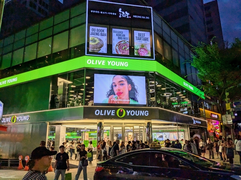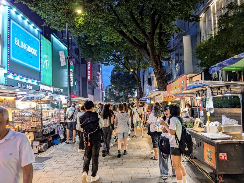 バスに乗って明洞のロッテヤングプラザ前で降りました。すごく都会で、道幅も広いです。